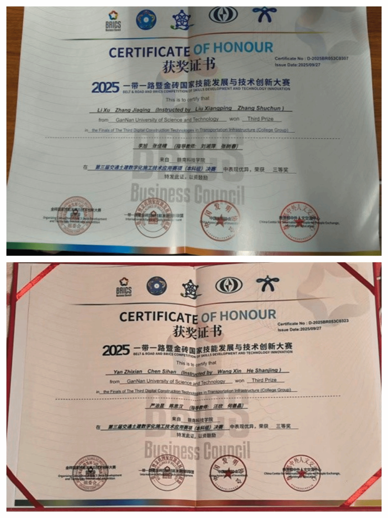 本网讯:近日,2025“一带一路”暨金砖国家技能发展与技术创新大赛第三届交通土建数字化施工技术应用赛项全国总决赛以及装配式建筑智能建造技术应用赛项全国总决赛先后在哈尔滨、武汉举办。我校资源与土木工程学院学子在赛事中表现突出,捷报频传,展现了扎实的专业素养与技术应用能力。