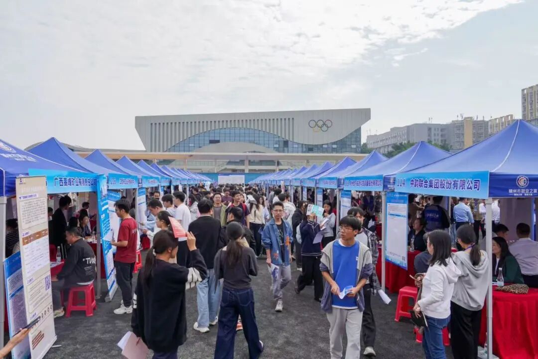 10月30日,由江西省总工会主办,赣州市总工会、赣州市人力资源和社会保障局、赣州市教育局、赣南科技学院承办,赣州市人才集团有限公司协办的全省“工会帮就业·情牵毕业生”专场招聘会暨“就”在赣州“虔城”似锦——赣南科技学院2026届毕业生秋季就业洽谈会在学校田径场顺利举办。本次招聘会吸引了来自全国各地的优质企业327家,广东汕尾、浙江遂昌、福建长汀等地人社部门组团来校招聘,提供就业岗位1190个,计划招聘(岗位需求人数)12000余人,招聘范围涵盖资源矿业、机械电气、材料冶金、电子信息、经济管理、文法艺术等多个领域,与学校学科专业设置高度契合。