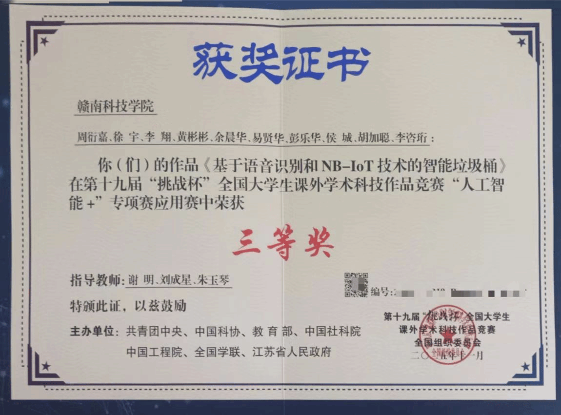 本网讯:近日,我校师生经预赛、初赛层层严苛选拔,最终凭借作品《基于语音识别和NB-IoT技术的智能垃圾桶》在第十九届“挑战杯”全国大学生课外学术科技作品竞赛“人工智能+”专项赛中斩获全国三等奖,实现了我校在这一重要国家级赛事中的零突破。